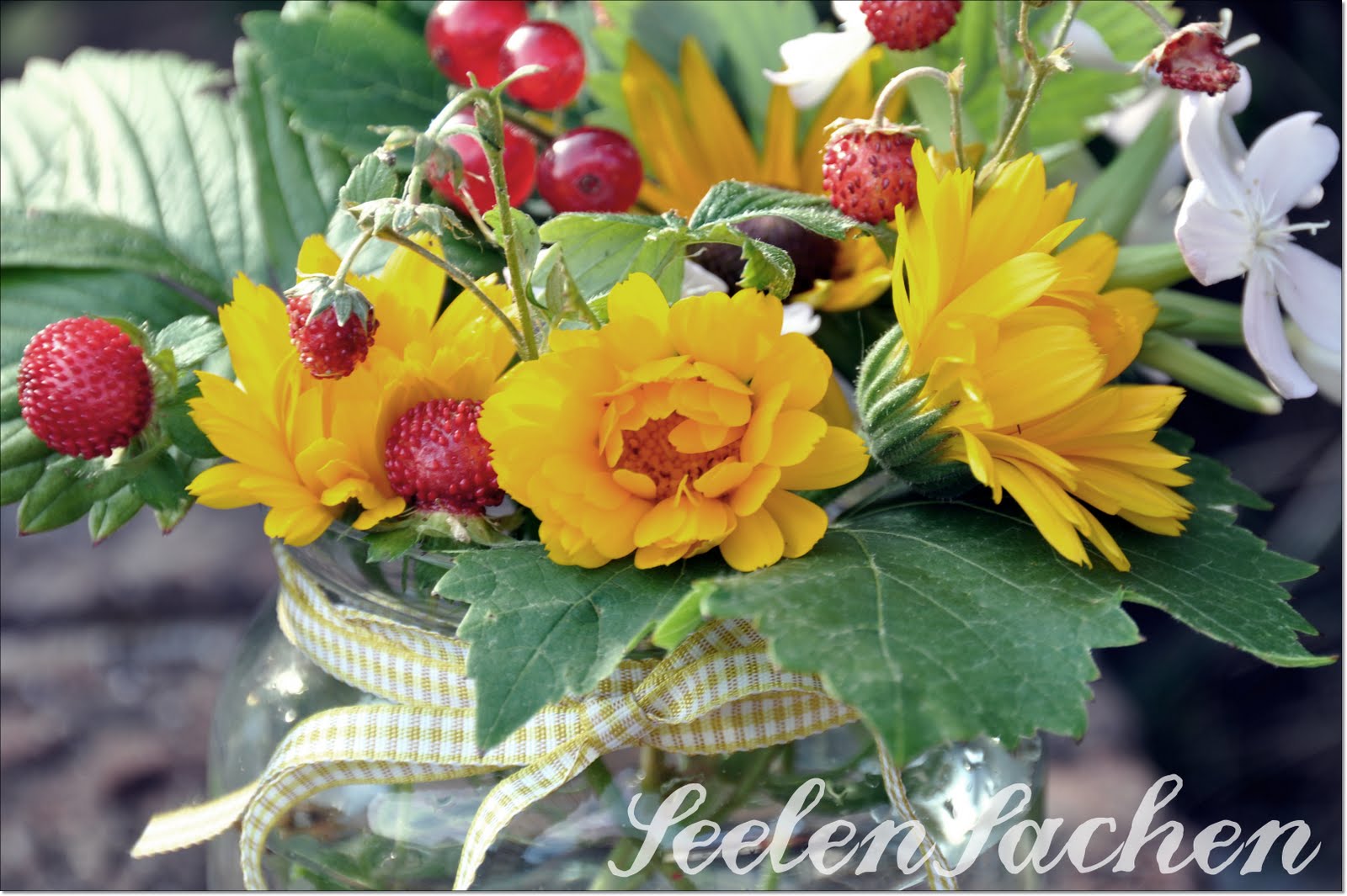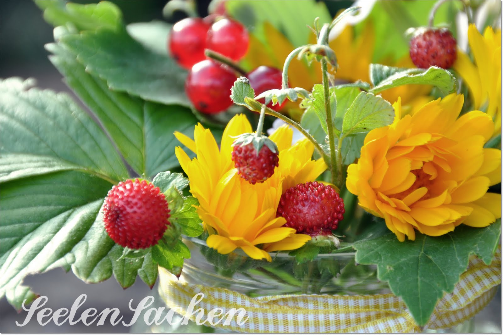 Danke für die schönen Bilder, Nora. Der Blumenstrauß ist echt super lieb. Die kleinen Erdbeeren und die Johannisbeeren darin finde ich richtig lieb.