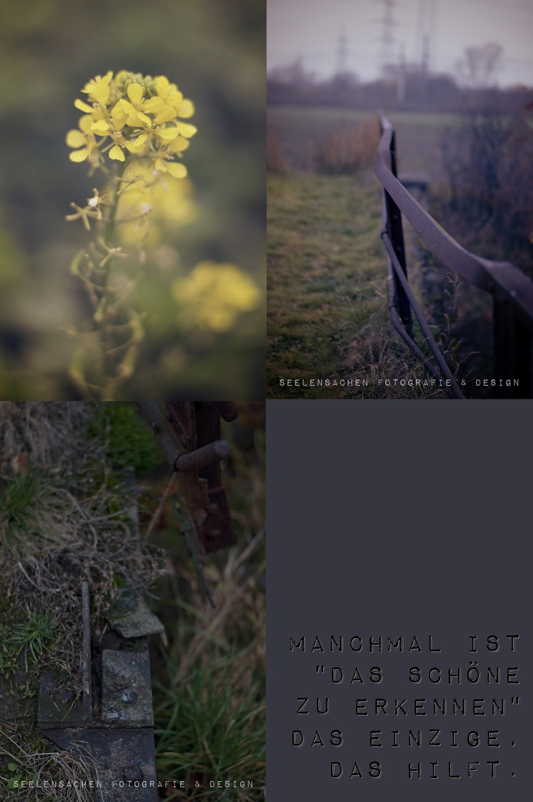 Deine Bilder haben einen ganz eigenen Reiz, besonders das Foto rechts oben mit dem Zaun? gefällt mir unheimlich gut!!! Schönheit liegt im Auge des Betrachters und es ist schlimm, wenn man so weit unten ist, das man nichts Schönes mehr sieht.