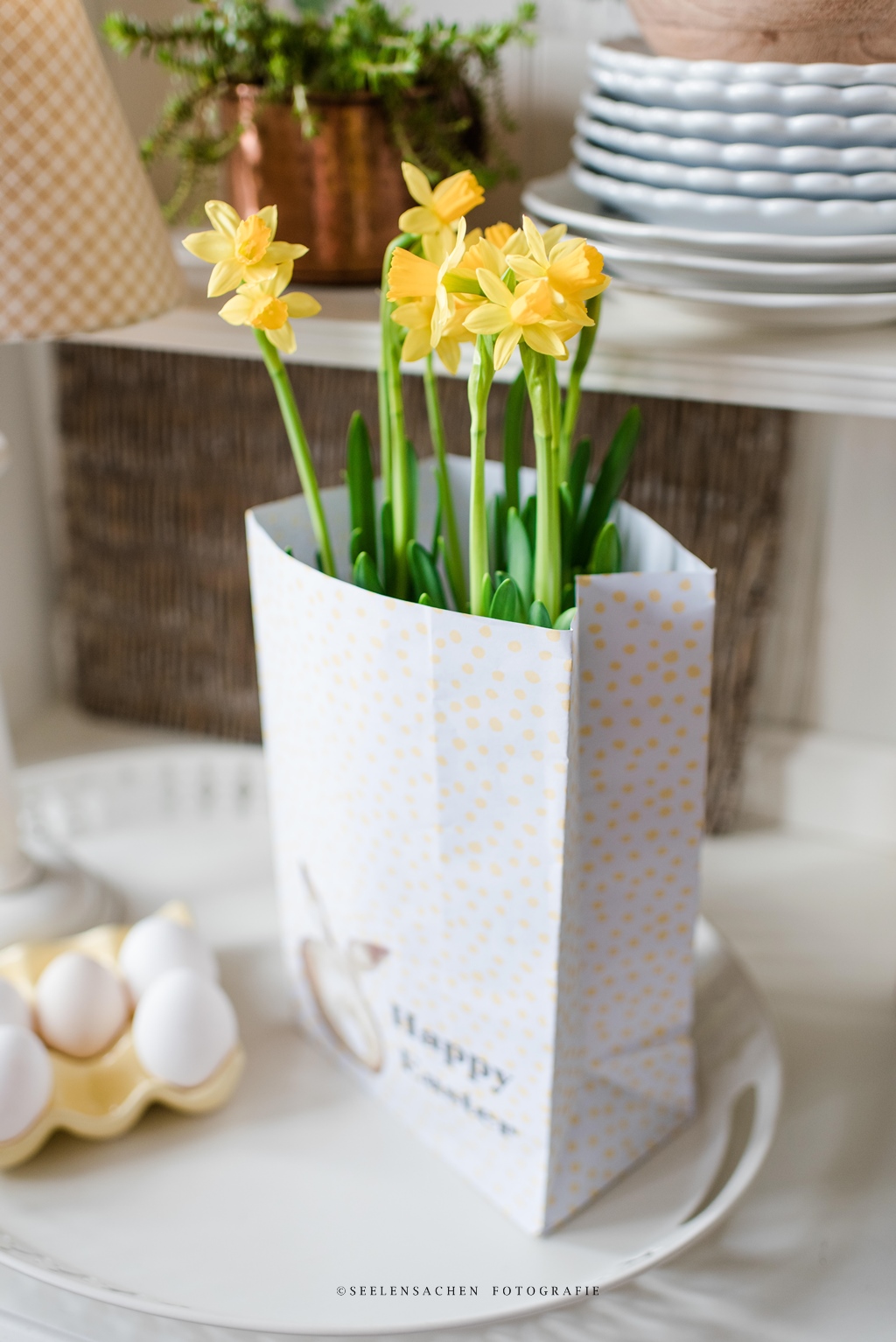 Frühblüher gehen immer! Auch wenn sie nach dem Aufblühen nicht lange halten – sie müssen einfach sein. Ich habe sie in einen Porzellanübertopf gegeben und den dann in das Papiersäckchen, das eigentlich als Geschenktüte gedacht ist, hineingestellt. So passiert dem Papier nichts, es sieht aber viel schöner aus, als nur einfach im Topf. Wenn die Blüten verblüht sind, schneide ich sie ab und genieße noch das Grün, so lange es geht. Danach lasse ich die Blätter vertrocknen, die Zwiebeln setze ich im Garten aus und nächstes Jahr wachsen sie dann von Neuem. Praktisch, oder?