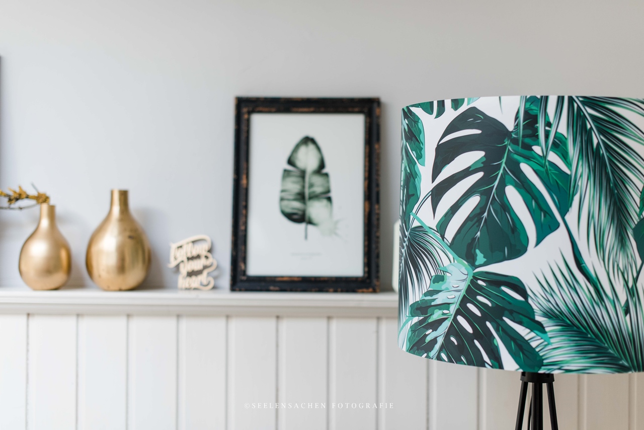 Wie ihr aber auch noch sehen könnt – das Muster der Grünpflanze zieht sich weiter durchs Wohnzimmer! Ich hab einen neuen Lampenschirm für unsere Stehlampe bekommen und den ziert – wie könnte es momentan anders sein – genau das grüne Muster! Der Lampenschirm ist aus meinem geliebten Hamburg zu uns gereist und ihr bekommt ihn bei Anna Wand*. Die Lampenschirme werden in Handarbeit in Deutschland aus reyclingfähigem, PVC-freiem Polyester gefertigt und zuvor mit Tinte auf Wasserbasis bedruckt. Der Lampenschirm lässt sich leicht abwischen und kann sowohl für Deckenleuchten oder für Stehlampen verwendet werden.