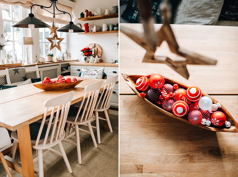 Zuletzt habe ich mich noch an einer Tischdekoration versucht. Hierfür habe ich Nadelbaumzweige in der Mitte des Tisches aufgelegt, dass die Spitzen jeweils nach außen schauen. In die Mitte des Arrangements habe ich große Weihnachtskugeln und goldene Dekorkugeln gelegt. Das Ganze mit ein paar Beeren und Blüten geschmückt und schon ist eine festliche Tischdeko, die nicht zu viel Platz wegnimmt auf der Tafel, dennoch aber was hergibt.