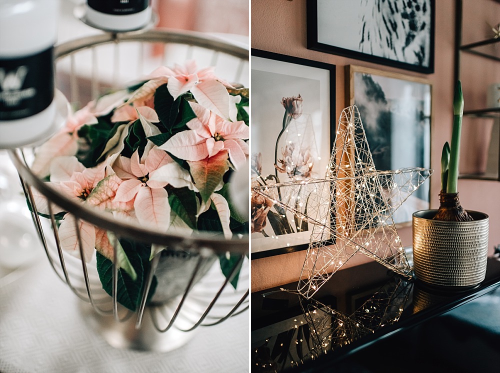 Kommen wir zum nächsten Farbschema. Wer es lieber ganz natürlich mag, ist mit weißem und zartrosafarbenem Weihnachtsstern und weißen Schneerosen, Naturmaterialien und hellen Kugeln gut beraten. Akzente habe ich mit Gold gesetzt. Besonders schön finde ich die filigranen “Schneeflocken”, die machen sich auch auf dem Christbaum gut.