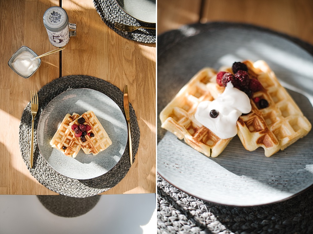 So und jetzt seid ihr sicher schon gespannt auf das Rezept, das teile ich natürlich gerne mit euch. Wir lieben Waffeln mit Sauerrahm und frischen Beeren oder mit Apfelmus oder einfach nur einem Schuss Ahornsirup. Ich werde auch eine vegetarische Variante nächstes Mal probieren (mein mittlerer Sohn mag keinen Topfen) und wenn das wieder so gut wird, teile ich das Rezept natürlich wieder mit euch 🙂 .